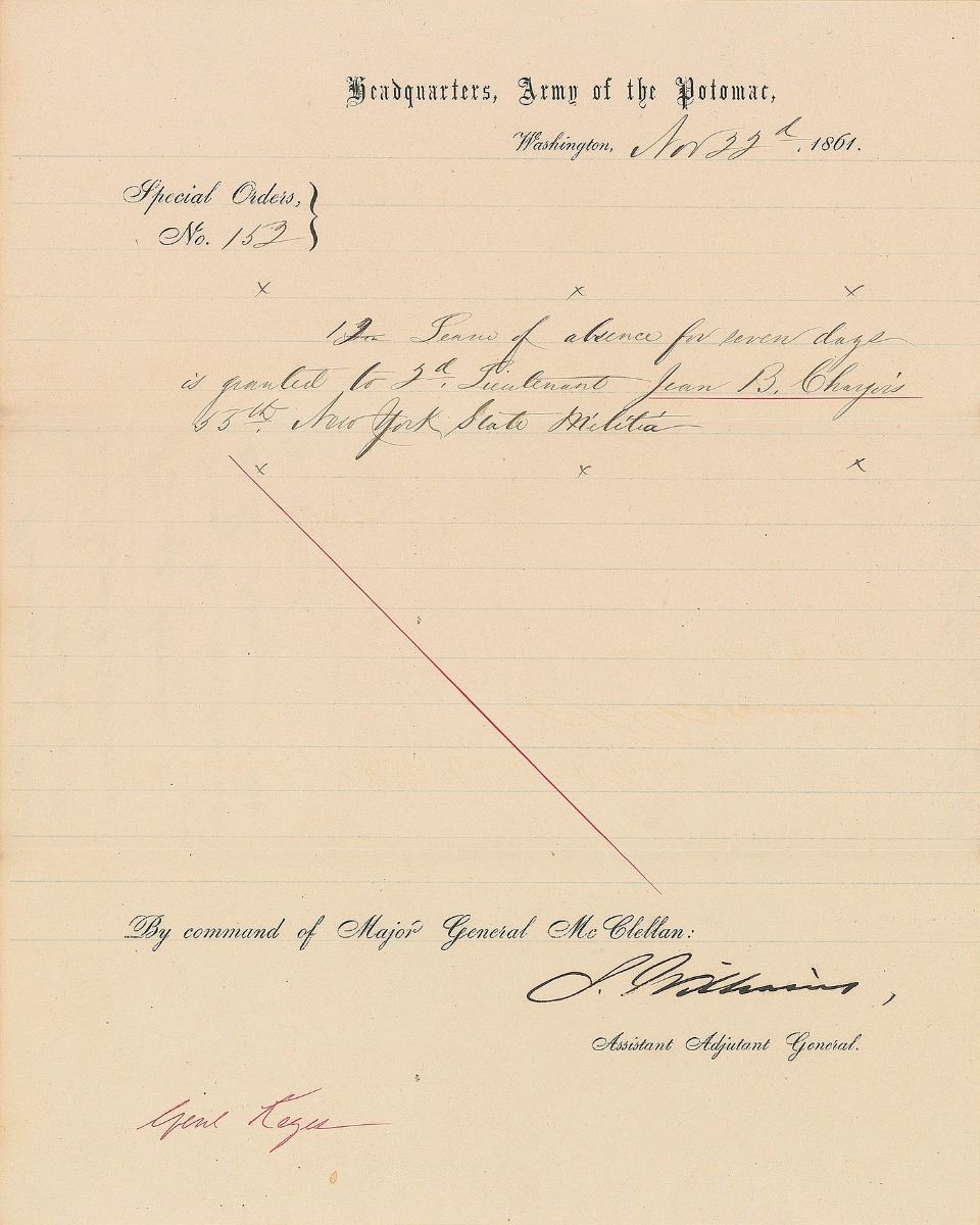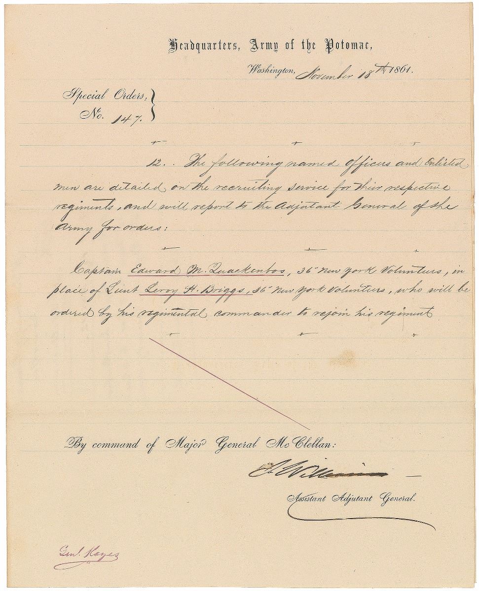 Two Civil War–dated DSs, signed “S. Williams,” each one page, 8 x 10, dated November 1861. Special Orders issued from the headquarters of the Army of the Potomac, including the approval of a leave of absence and an assignment for recruiting service. In overall fine condition. Williams served as assistant adjutant general of the Union’s Army of the Potomac throughout the Civil War.