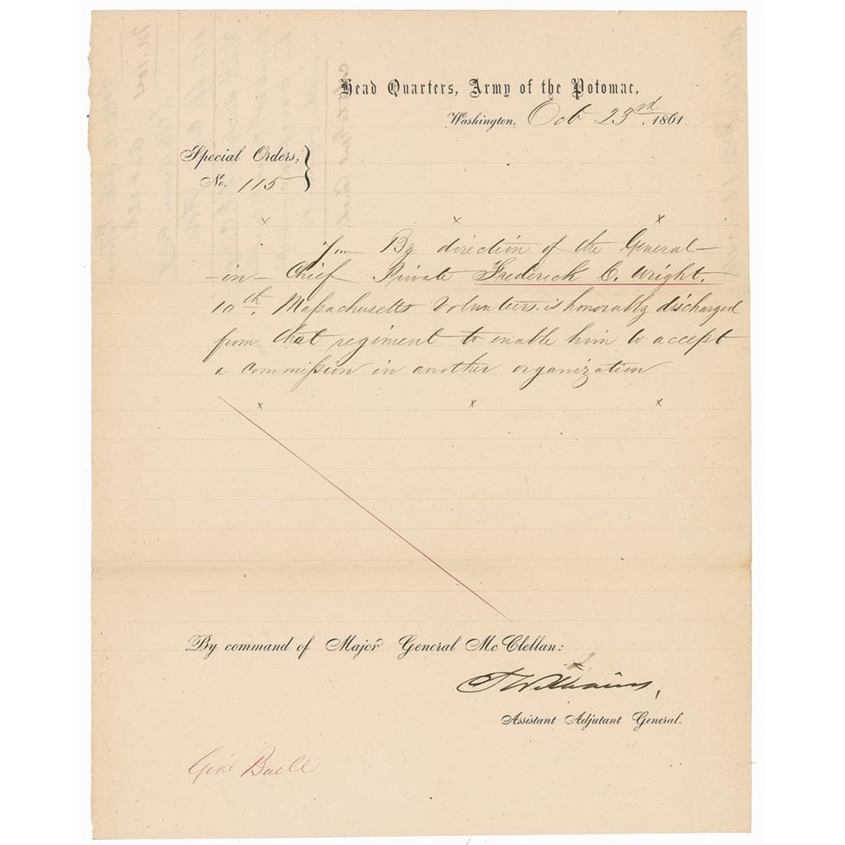 American military figure (1822–1866) who served as assistant adjutant general of the Union's Army of the Potomac during the Civil War. Partly-printed DS, signed “S. Williams,” one lightly-lined page, 8 x 10, October 23, 1864. Williams, “by direction of the General-in-Chief,” signs an honorable discharge order for “Private Frederick C. Wright, 10th Massachussetts Volunteers…to enable him to accept a commission in another organization.” In fine condition, with areas of faint toning.