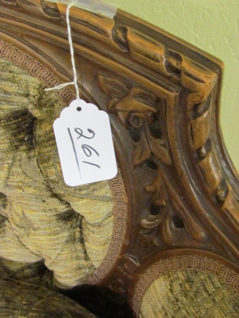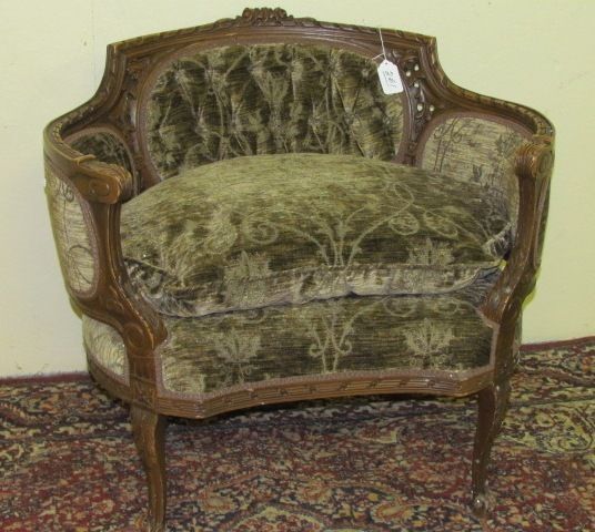 French Provincial bowed tapestry Settee with carved crest, on cabriolet legs