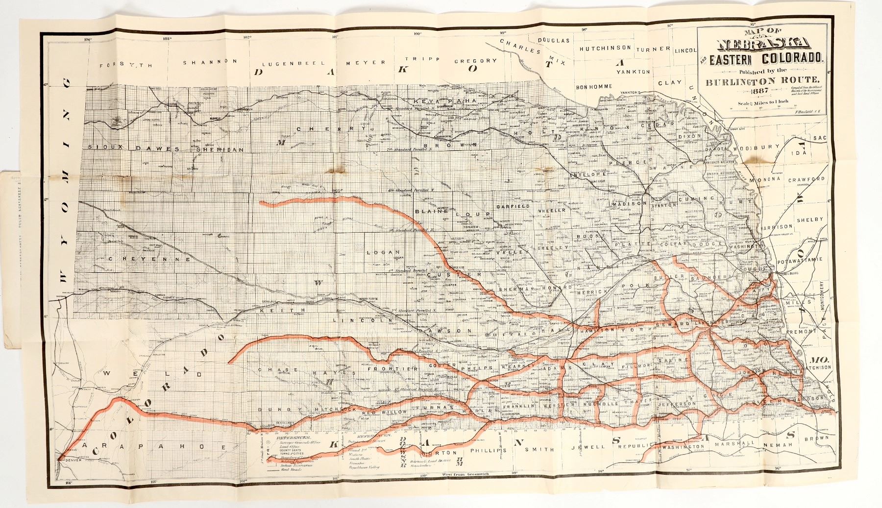Copy of 'An Invitation to South-East Nebraska' by Hon. Robert W. Furnas, a booklet published by the Burlington Route Passenger Department of Omaha, Nebraska in 1887. Printed by Journal Company State Printers of Lincoln, Nebraska. The booklet contains a general description of Nebraska's attractive qualities for settlers as well as a more specific alphabetized list describing individual counties. Contains a large fold-out sectional map of the state illustrating its county lines with highlighted railroad routes. Paper binding, 10 pages plus map. Large stain at top of cover/pages as well as some tearing of spine. Some tearing at creases of map; see photos. 5.75"x8.75".