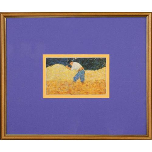 This print of Seurat?s (1859-1891)The Stone Breaker is a beautiful representation of the original. The deep blues in the background contrast perfectly with the warm yellows of the foreground. This picture of a man breaking stones is in the typical impressionistic style of Seurat. The print is in very good condition and is matted in a gold and blue double mat that echoes the colors used in the print. The slim light stained wood frame also brings out the colors of this print. The print itself measures 5? x 7.5? but measures 16.5? x 18.5? after the frame is added.