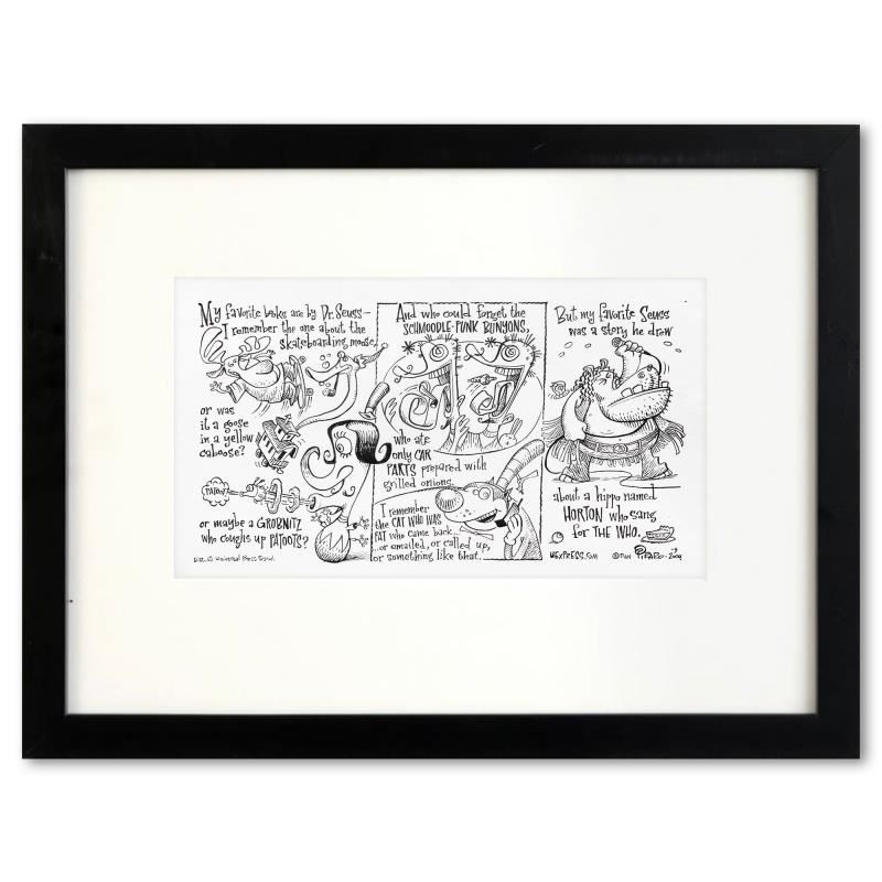 Enter a surreal and satirical world of twisted imagination and award winning creativity. "Seuss Confusion" is an original pen & ink drawing on paper by Dan Piraro, creator of the critically acclaimed and award winning comic strip, Bizarro. This piece is hand signed, comes custom framed and includes a letter of authenticity. Measures approximately 14" x 21" (frame), 7" x 13" (image).This item requires special handling and may have a longer than usual turnaround.