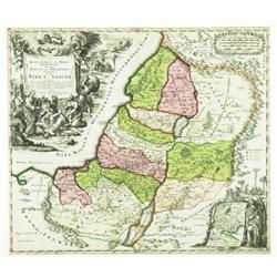 REGIO CANAAN ...JUDAEA VEL PALAESTINA NOMINATA, HODIE TERRA SANCTA.. [c. 1730], hand-coloured, some spotting, lower half of c/f split, reinforced verso, small loss to upper left corner of neatline, contemporary ms. notes in ink verso. A decorative map of the Holy Land with a small inset map of the Twelve Tribes. Framed.