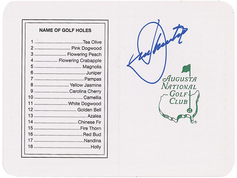 Augusta National Golf Club scorecard, measuring 6.5 x 4.75 opened, signed on the front in blue felt tip by Ballesteros. In very fine condition.