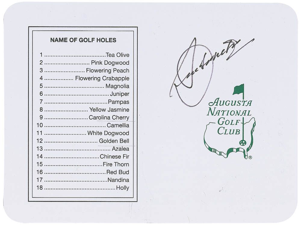 Augusta National Golf Club scorecard, measuring 6.5 x 4.75 opened, signed on the front in black felt tip by Ballesteros. In fine condition.