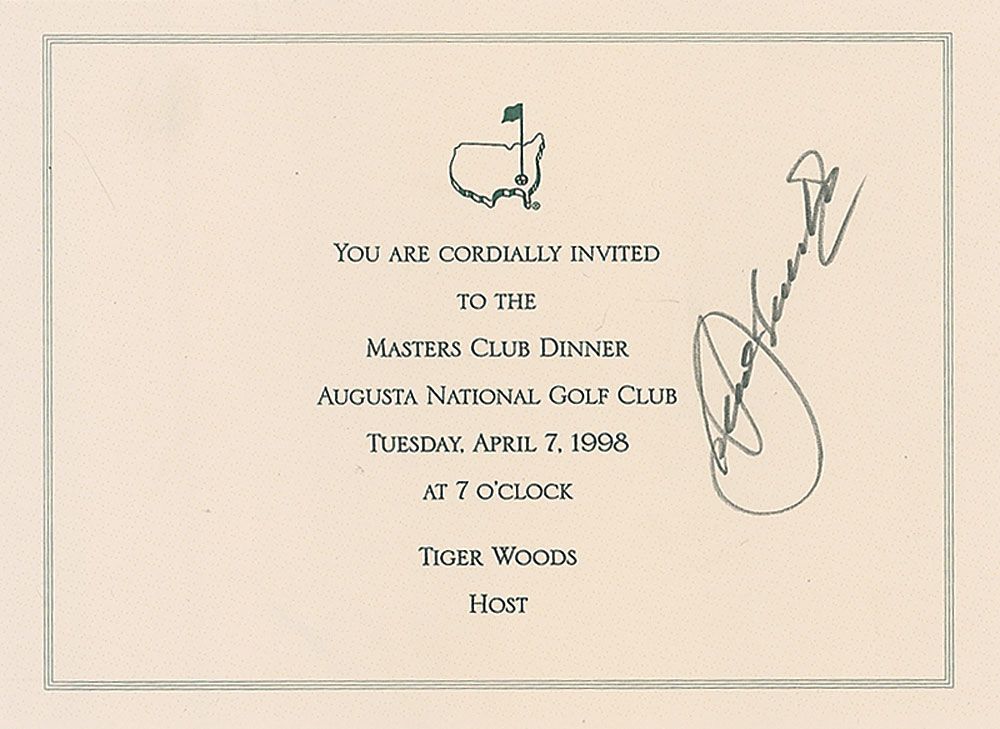 Invitation card to the Masters Club Dinner at Augusta National on April 7, 1998, 7.5 x 5.5, signed in black felt tip by Ballesteros. In fine condition.