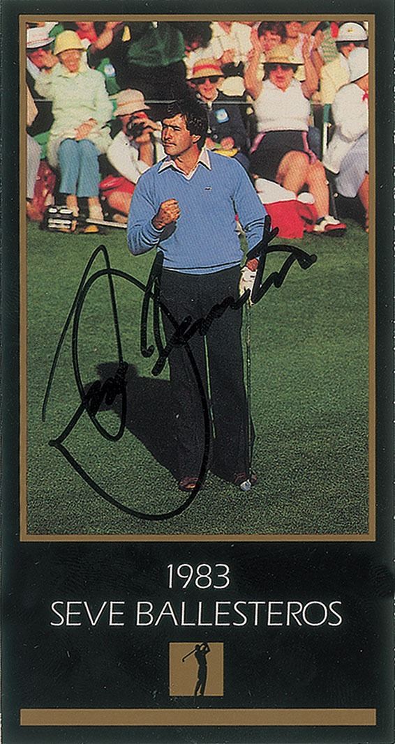 A 1993 Masters Champions of Golf card for Seve Ballesteros, 2.5 x 4.75, signed on the front in black felt tip. In fine condition.