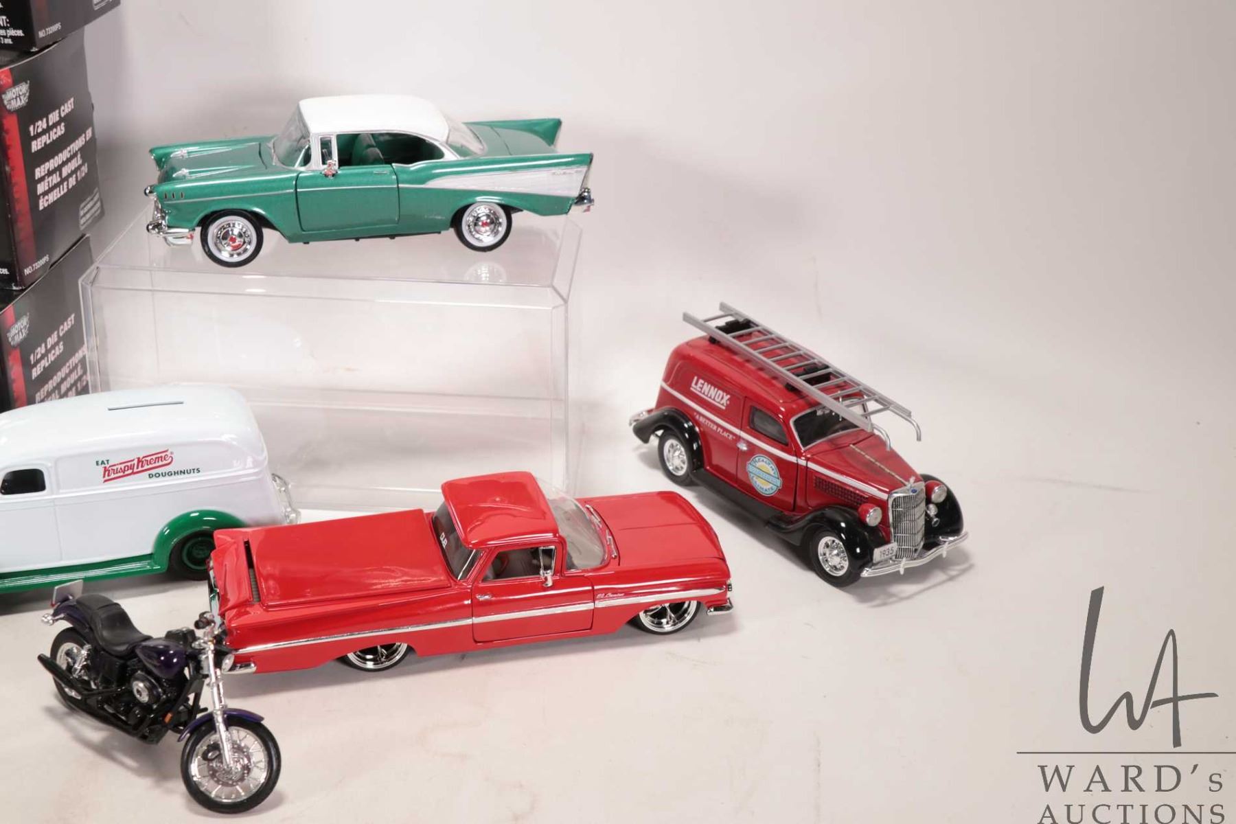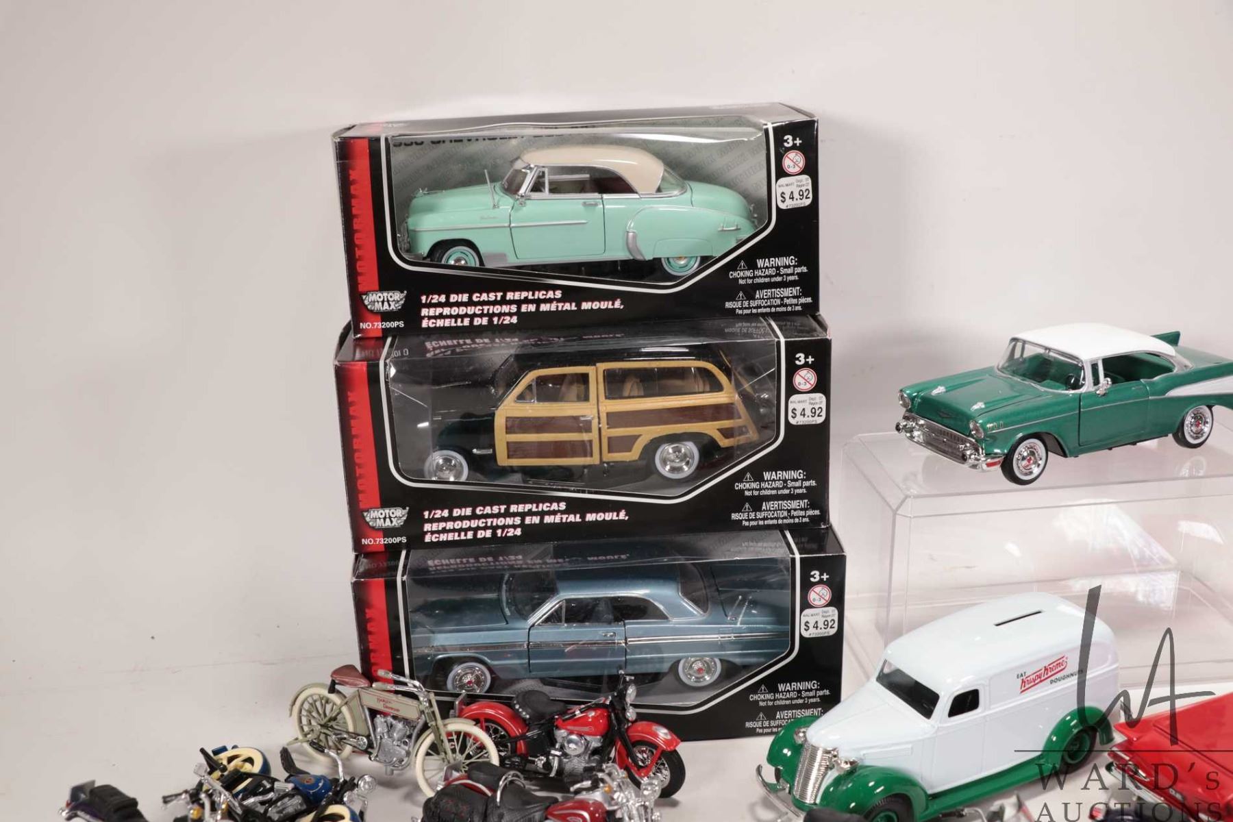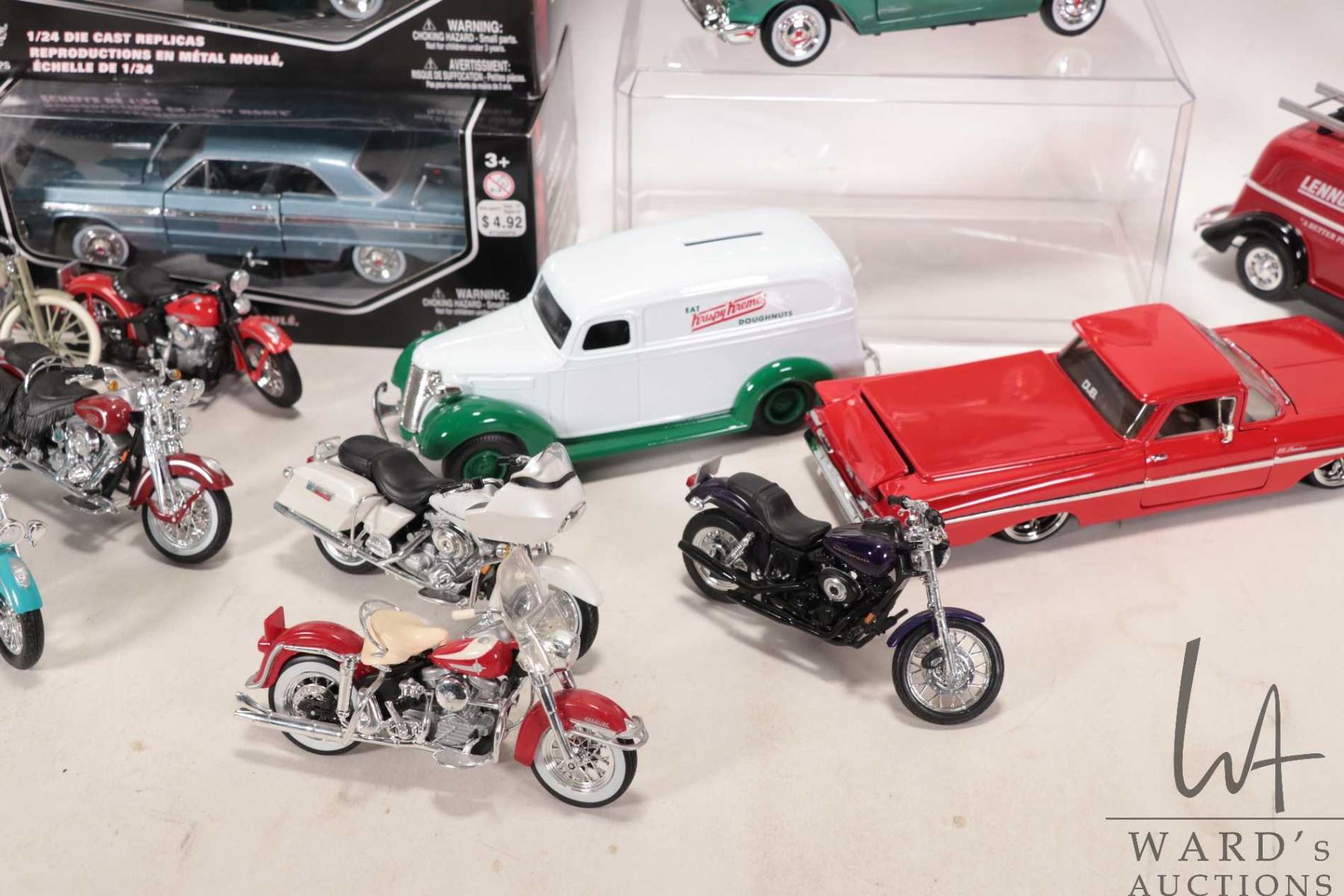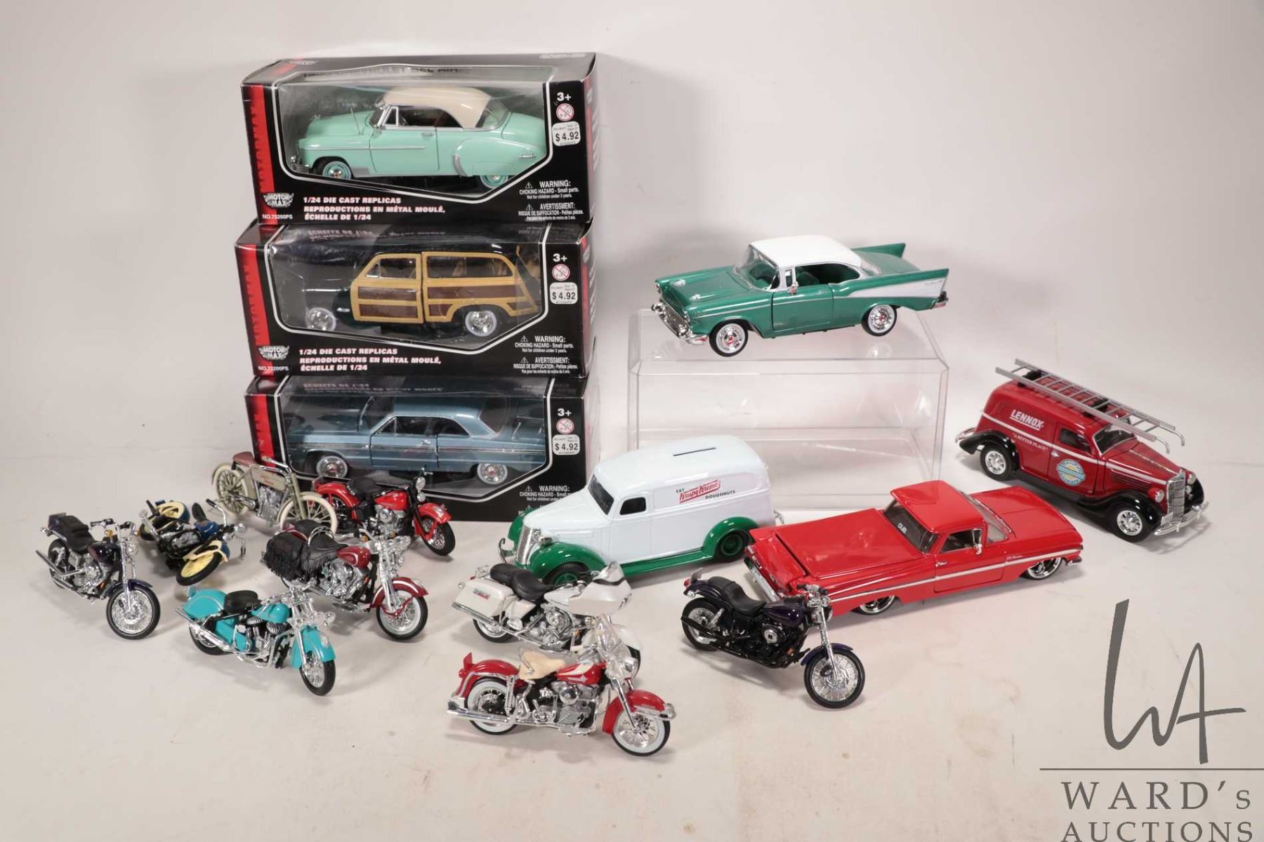 Seven 1:24th scale die cast models including three boxed and nine die cast motorcycles