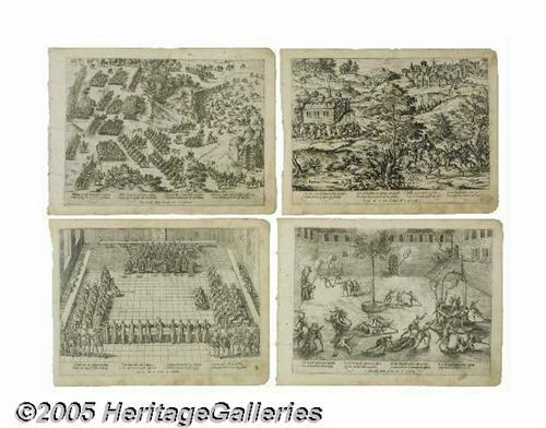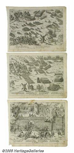 <B>Seven 16th Century Engravings by Frans Hogenberg</B></I> This lot contains seven engravings removed from a period book by the legendary Frans (Franz) Hogenberg, a painter, engraver and etcher. He was probably a pupil of the cartographer H. Terbruggen in Mechelen, but later worked in Antwerp producing engravings. He travelled to Poitiers in 1560, and to England in 1568. From 1570 he was known to be in Cologne, where he engraved various illustrations and maps. Offered here are seven engravings of 12" x 9" showing what we believe to be various scenes of the battles and sieges which happened in the Netherlands during the Spanish War and the Dutch Inquisition. Each is captioned in German and dated at the bottom, mostly 1561 and 1562. These were likely published in the 1580s as illustrations for a history book. All are in fine condition with only minor wear, soiling and edge roughness. Worthy of further research. Lot:253