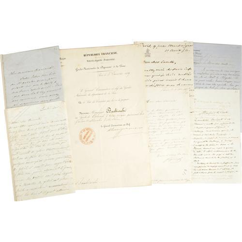 <B>Group of Seven Letters and Documents by French Admirals.</B></I> Mixed material from an old collection as follows: <BR><B>Mackau,</B></I> ALS, three pages, 5.25" x 8", 1851;<BR><B>Espinasse,</B></I> ALS, one page, 5.25" x 8.25", 1857;<BR><B>Ronciere le Nourrit Clemente,</B></I> ALS, three pages, 5.25" x 8", on letterhead, 1863;<BR><B>Ferdinand Alfonzo Hammeline,</B></I> ALS, two pages, 5" x 8", on letterhead, n.d.<BR><B>Rigault,</B></I> ALS, three pages, 5.5" x 8", on letterhead, 1854;<BR><B>Edgardo Ney,</B></I> ALS, 3 pages, 5.5" x 8", n.d.;<BR><B>Changarnier,</B></I> DS, one page, 8.25" x 12.5", 1849.<BR>All items are lightly toned with expected folds. Fine condition.<BR><BR><b>Shipping:</b> Flat Material, Small (<a target="_blank" href="http://www.heritageauctions.com/common/shipping.php">view shipping information</a>)