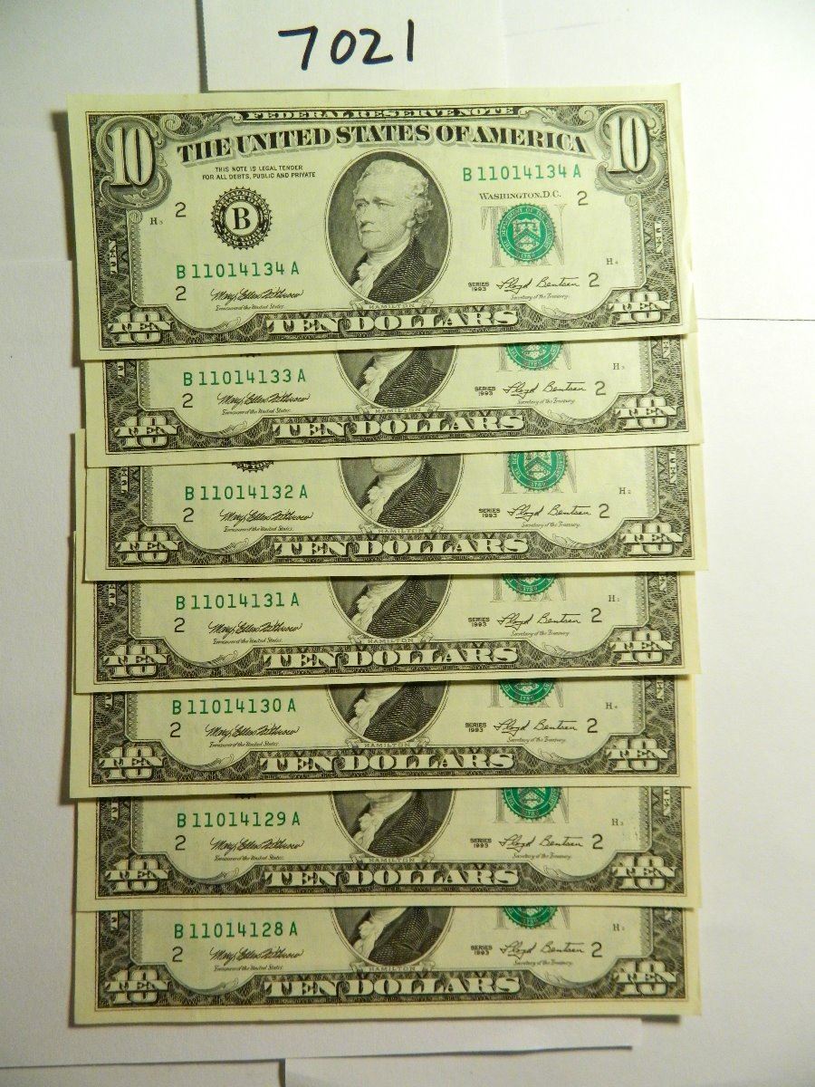 Seven (7) Sequentially Numbered 1993 $10 Bills, UNC, All One Money, Nice estate Find!