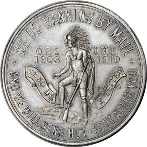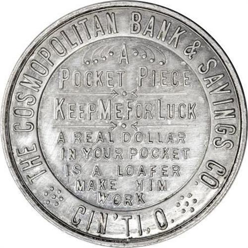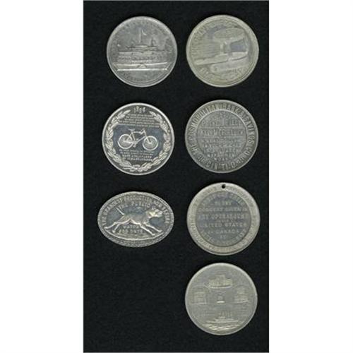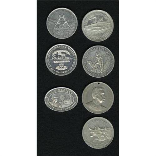 <B>Seven Aluminum Tokens With Cosmopolitan Bank and Savings Co.</B></I> These seven tokens date from the Gilded Age and the 20th century to the start of World War I. Includes: <B>1910 Cosmopolitan Bank and Savings Co.</B></I>, obverse with rifle-bearing Native American, reverse financial platitudes; <B>1896 Innes' Famous Band Children's Admission Token</B></I>, Rulau-Phl-27, 39 mm, portrait of bandleader obverse, terms of admission reverse, holed at top; <B>1901 W.F. Doll "The Dairy Farm" Token</B></I>, pair of yoked oxen heads obverse, historic buildings with Liberty Bell and <I>U.S.S. Maine </B></I>reverse; <B>1893 Crescent City Athletic Club Boxing (Hall vs. Fitzsimmons) Token</B></I>, Rulau-La-No-15, 37mm, building obverse, bareknuckle pugilists reverse; <B>1894 St. Louis Refrigerator & Wooden Gutter Co.</B></I>, Rulau-STL-9, 39 mm, obverse scrolls and shield with text "Manufacturers of the Lu-mi-num Aluminum Bicycles", reverse nine lines of text with bicycle surrounded by wreath and dated 1894; <B>(Circa 1900) Al. W. Martin's Theater Token for Uncle Tom's Cabin</B></I>, oval, obverse with idealized man and log cabin vignette, reverse dog; and a <B>Bernardin Bottle Cap Co.</B></I> <B>Token</B></I>, obverse with old-time bottlecap, reverse with manufacturing plant.<BR><BR><b>Shipping:</b> Coins & Currency (<a target="_blank" href="http://www.heritageauctions.com/common/shipping.php">view shipping information</a>)