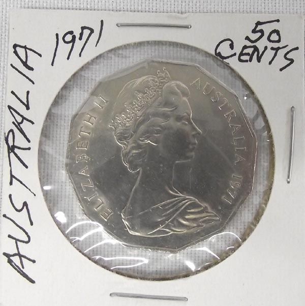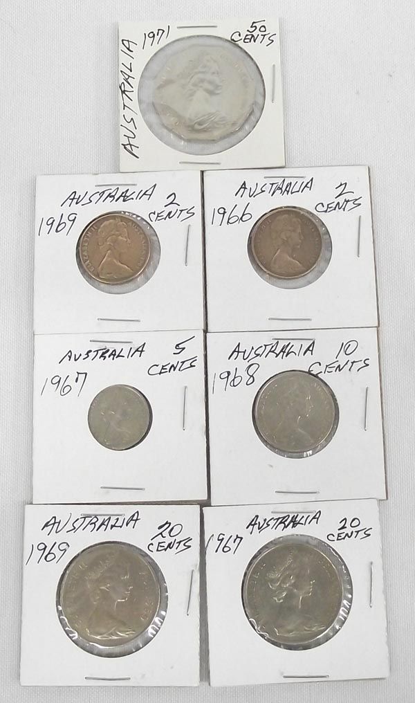 Seven Australian Coins. 1)One 50 cent coin, 1971 2)Two 20 cent coins, 1967 and 1969 3)10 cent coin 1968 4)One 5 cent coin 1967 5)Two 2 cent coins, 1966 & 1969.