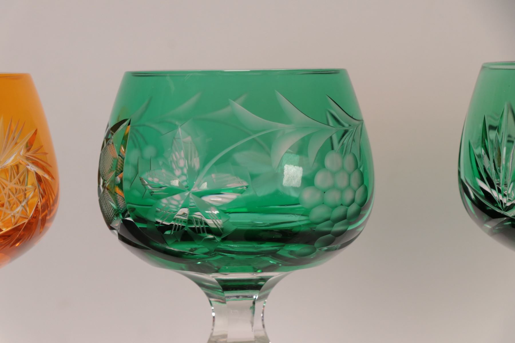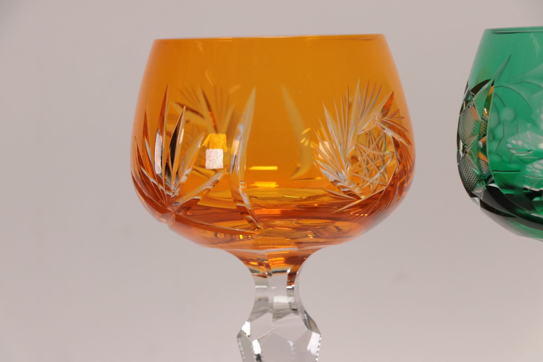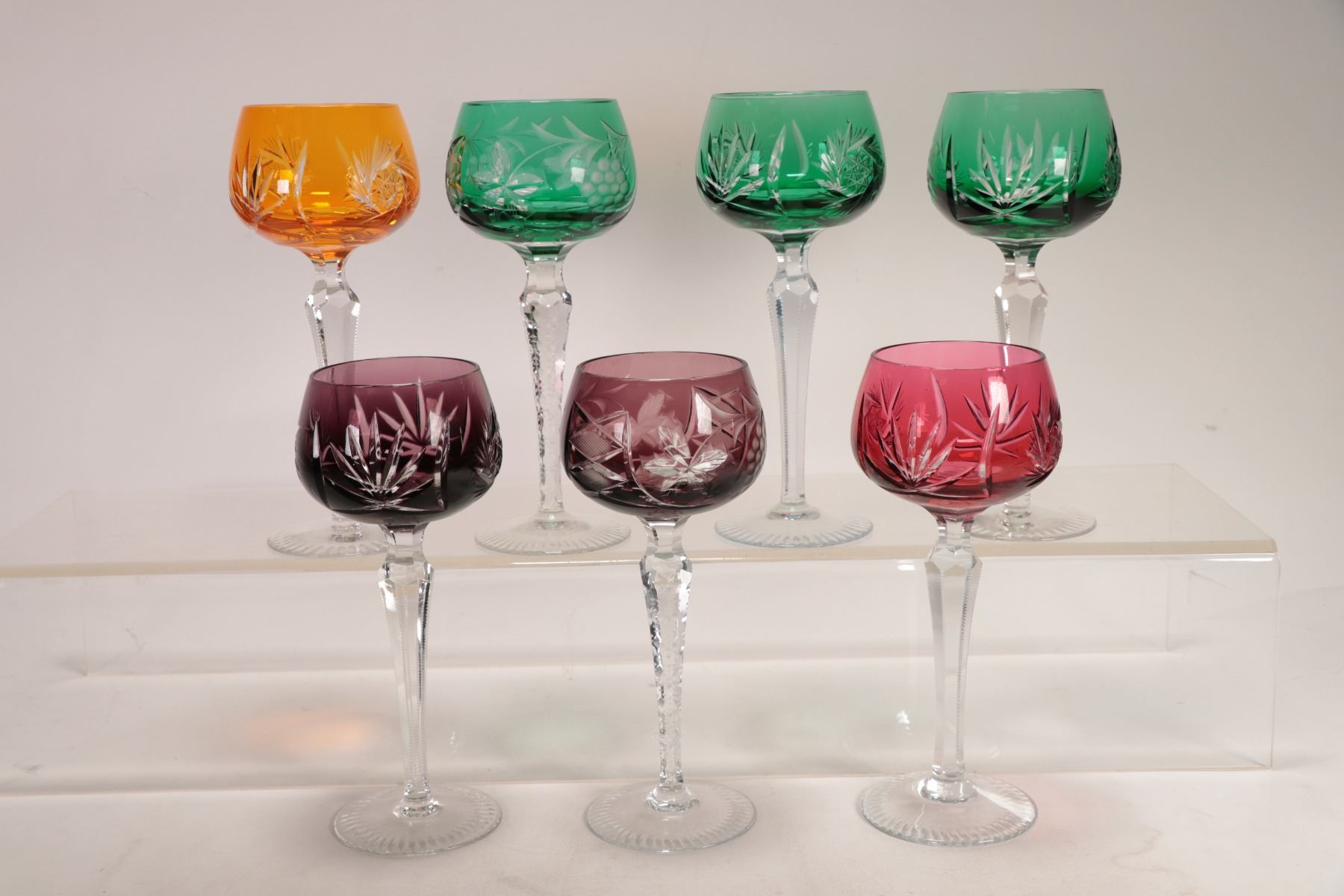 Seven Bohemian coloured cut to clear crystal hock wine glasses, each 7 3/4" in height