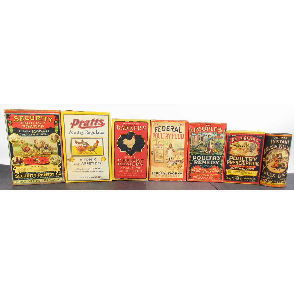 Seven Boxes of Veterinary Products. Security Poultry Powder, Pratts Poultry Regulator, Barker's & Peoples Poultry Remedy, Federal Poultry Food, Doctor LeGear's Poultry Prescription, and Dr. Hess's Instant Louse Killer. Outstanding color and graphics. Good to excellent condition. Largest box measures 6 X 9 X 3 inches.