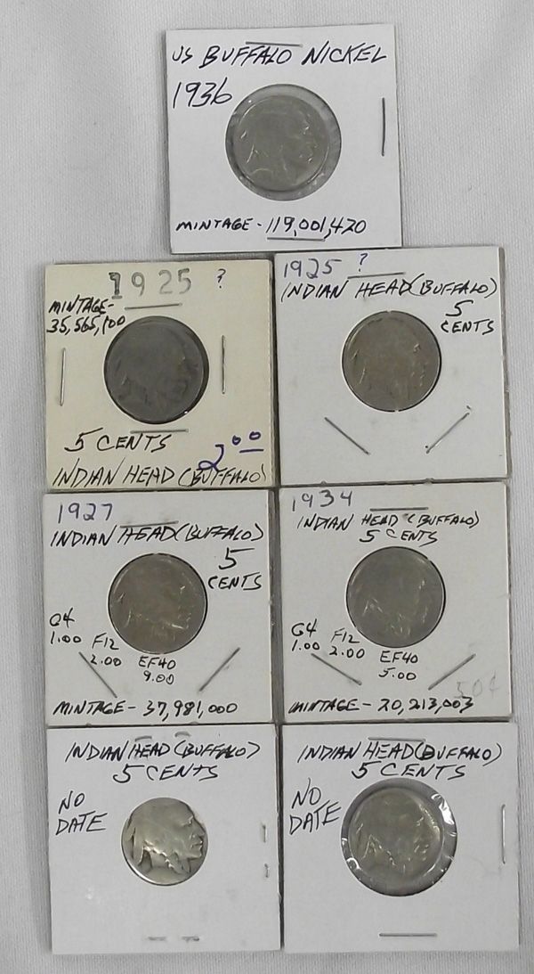 Seven Buffalo Head Nickels to include: 2- 1925, 1- 1927, 1-1934, 1-1936, 2-no dates. In my opinion, Good Condition.