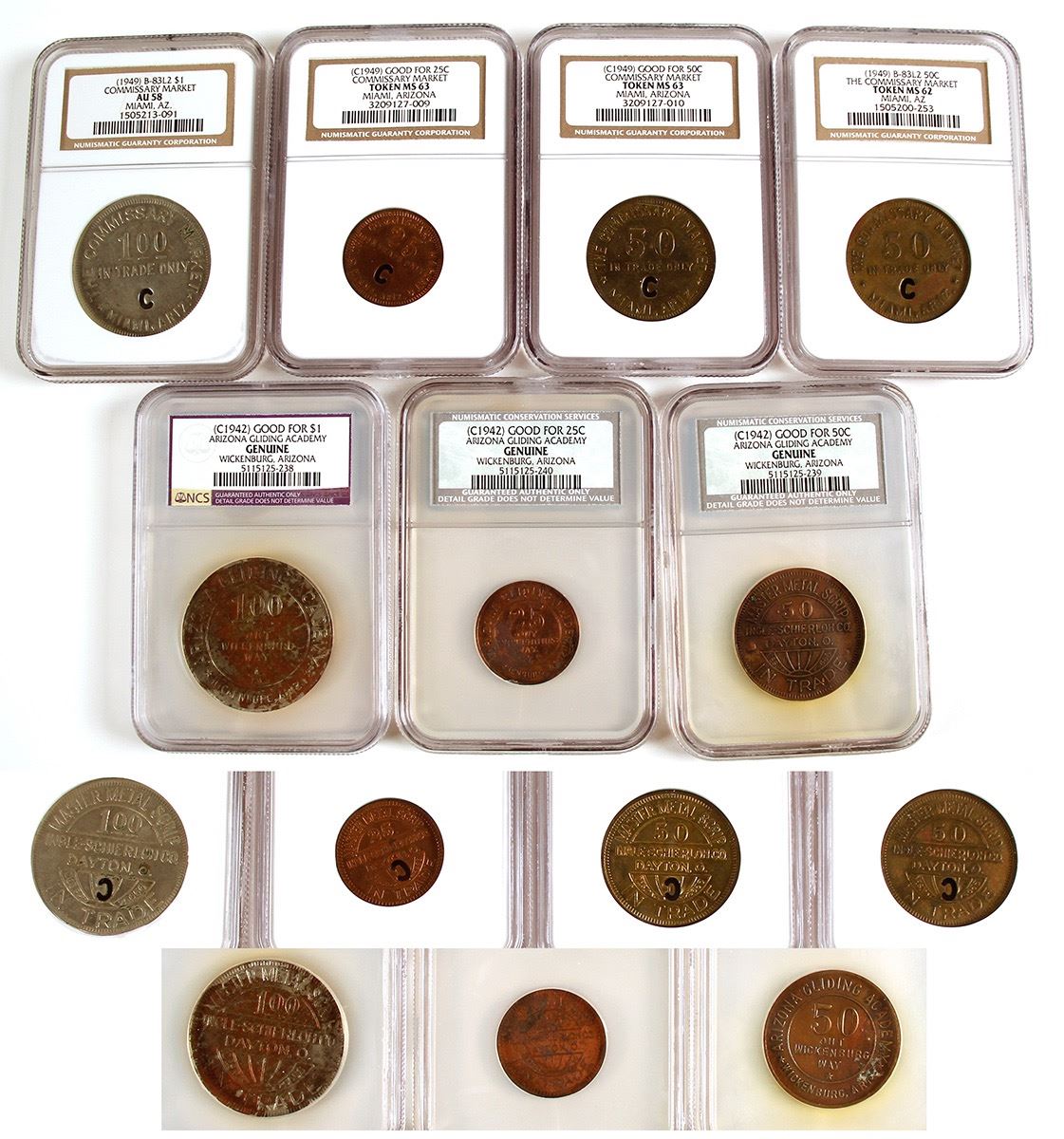 Seven tokens. Three certified Genuine, four graded AU 58 through MS 63. Four from Miami, three from Wickenburg. Four Commissary market, three Arizona Gliding Academy. State: Arizona City: Miami and Wickenburg Date: ID# 77709