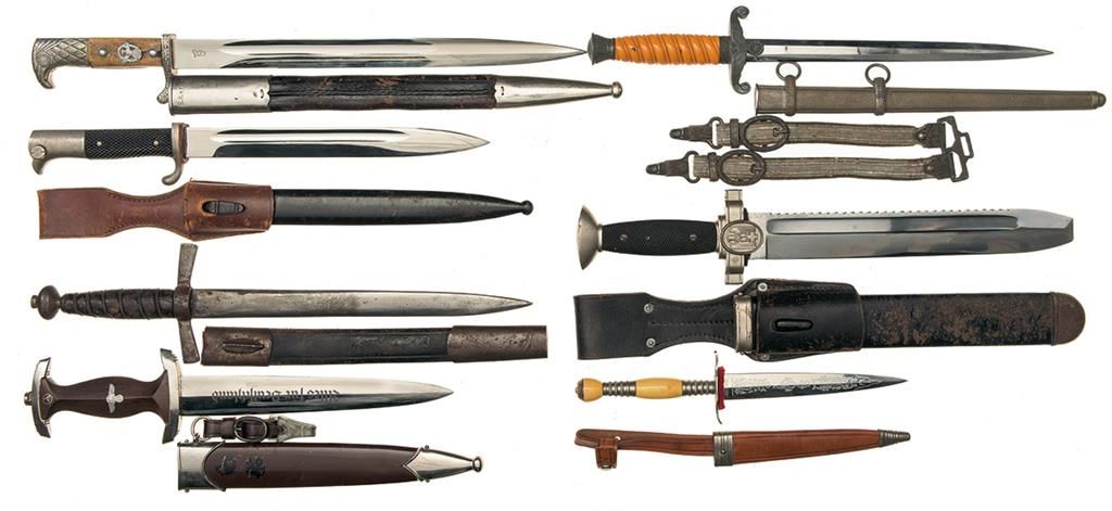 Includes a Red Cross Enlisted Knife, 2 parade bayonets, non-regulation Solingen Naval-themed dagger, unmarked Heer-style dagger and a SA dagger with repainted scabbard. Good overall.