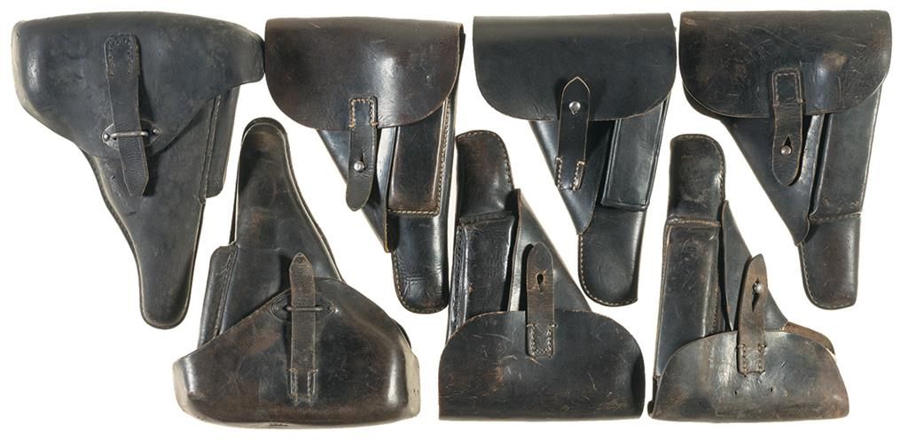 Unmarked P38 holster with Astra magazine, gxy P38 holster dated 1942 with magazine, bdr P38 holster dated 1943 with magazine, jwa P38 holster, jhg P38 holster dated 1944, P38 holster with magazine and reproduction P38 style holster. Overall fair to good.