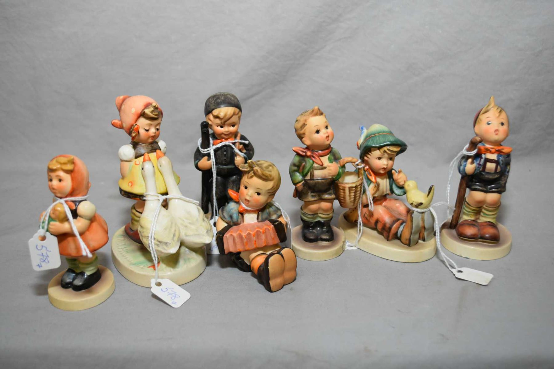 Seven Goebel and Hummel figures including "Chimney Sweep", "Goose Girl" etc.