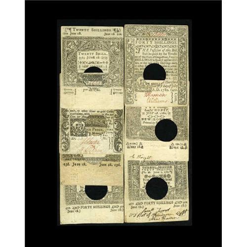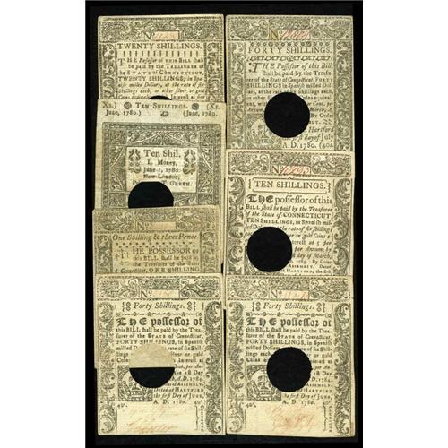 <B>Seven Hole-Canceled Late Date Connecticuts.</B></I> All are from 1780 issues and all are high grade, ranging from <B>Extremely Fine</B></I> to fully <B>Uncirculated</B></I>.
