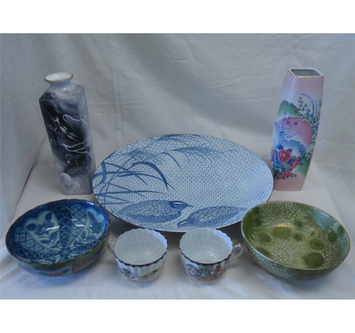 Seven pieces of Japanese dishware. Assorted sizes 3" Diameter to 13 3/4" Diameter. - Shipping charge are for the United States. The shipping on this lot is $30.00. Outside the United States there will be additional shipping fees.