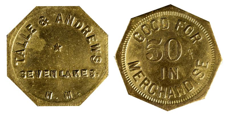 Obverse: Talle & Andrews / Seven Lakes, / N.M.; reverse: Good For / 50c / In Merchandise. Br, oc, 36mm, R10. Extremely fine condition, dark toning. Located 43 miles northeast of Gallup. The area used to have a total of seven lakes, today only one remains and it is usually dry thoughout the year.