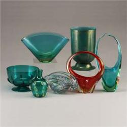 Seven MURANO glass vases including a footed bowl by MVM CAPELLIN. Some minor scratches to a few pieces. Bowl etched MVM/Cappellin/Murano. Tallest 12" $200-350