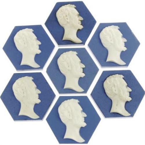 <B>Group of Seven Matching Lincoln "Cameo" Style Tiles.</B></I> Hexagonal in shape and 3.25" x 2.88" (x .5" thick not including portrait) in size, these blue tiles from The Mosaic Tile Company of Zanesville, Ohio and New York City each have a high-relief right-facing bust of Abraham Lincoln in white. This company was founded in 1894 by Karl Langerbeck and Herman Mueller and manufactured many types of plain and ornamental tiles for more than 60 years.<BR><BR><b>Shipping:</b> Miscellaneous Collectibles, Smal (<a target="_blank" href="http://www.heritageauctions.com/common/shipping.php">view shipping information</a>)