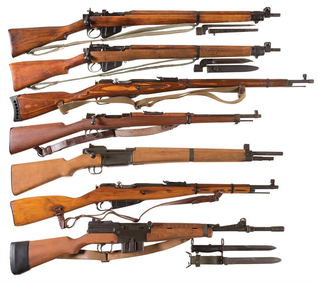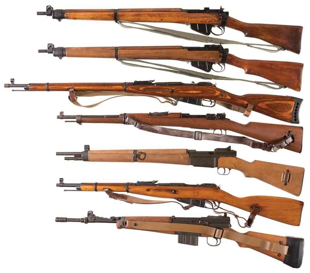 Seven Military Long Guns -A) Enfield No. 4 MK2 (F) Bolt Action Rifle with Bayonet