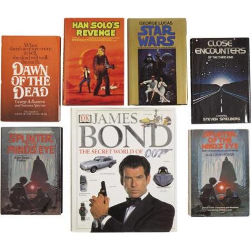 <B>Seven Movie-Related Books</B></I>, <B>George Lucas. </B></I><B><I>Star Wars</B></I></B></I>. New York: Ballantine Books [1977]. Octavo. 183 pages. Black cloth with gilt titles on spine and front cover. [and:] <B>Steven Spielberg. </B></I><B><I>Close Encounters of the Third Kind</B></I></B></I>. New York: Delacorte Press [1977]. First edition. Octavo. 256 pages. Quarter black cloth over gray paper boards. Silver spine titles. [and:] <B>George Romero and Susanna Sparrow. </B></I><B><I>Dawn of the Dead</B></I></B></I>. [New York]: St. Martin's Press [1978]. Octavo. 210 pages. Quarter orange cloth over orange paper boards. Black spine titles. [and:] <B>Alan Dean Foster. </B></I><B><I>Splinter of the Mind's Eye</B></I></B></I>. New York: Ballantine Books [1978]. First edition. Octavo. 216 pages, untrimmed. Navy-blue cloth with gilt spine titles. [and:] <B>Alan Dean Foster. </B></I><B><I>Splinter of the Mind's Eye</B></I></B></I>. London: Souvenir Press [1978]. First British edition. Octavo. 216 pages. Navy-blue cloth with gilt spine titles. [and:] <B>Brian Daley. </B></I><B><I>Han Solo's Revenge</B></I></B></I>. New York: Ballantine Books [1979]. First edition. Octavo. 198 pages. Quarter red cloth over orange paper boards. Gilt spine titles. [and:] <B>Alastair Dougall. </B></I><B><I>James Bond: The Secret World of 007</B></I></B></I><B>. Illustrated by Roger Stewart</B></I>. New York: Dorling-Kindersley, 2000. First U.S. edition. Folio. 144 pages. Illustrated case binding. Overall, books and dust jackets are near fine to fine. <I>From the Robert and Diane Yaspan Collection.</B></I><BR><BR><b>Shipping:</b> Books & Catalogs (<a target="_blank" href="http://www.heritageauctions.com/common/shipping.php">view shipping information</a>)