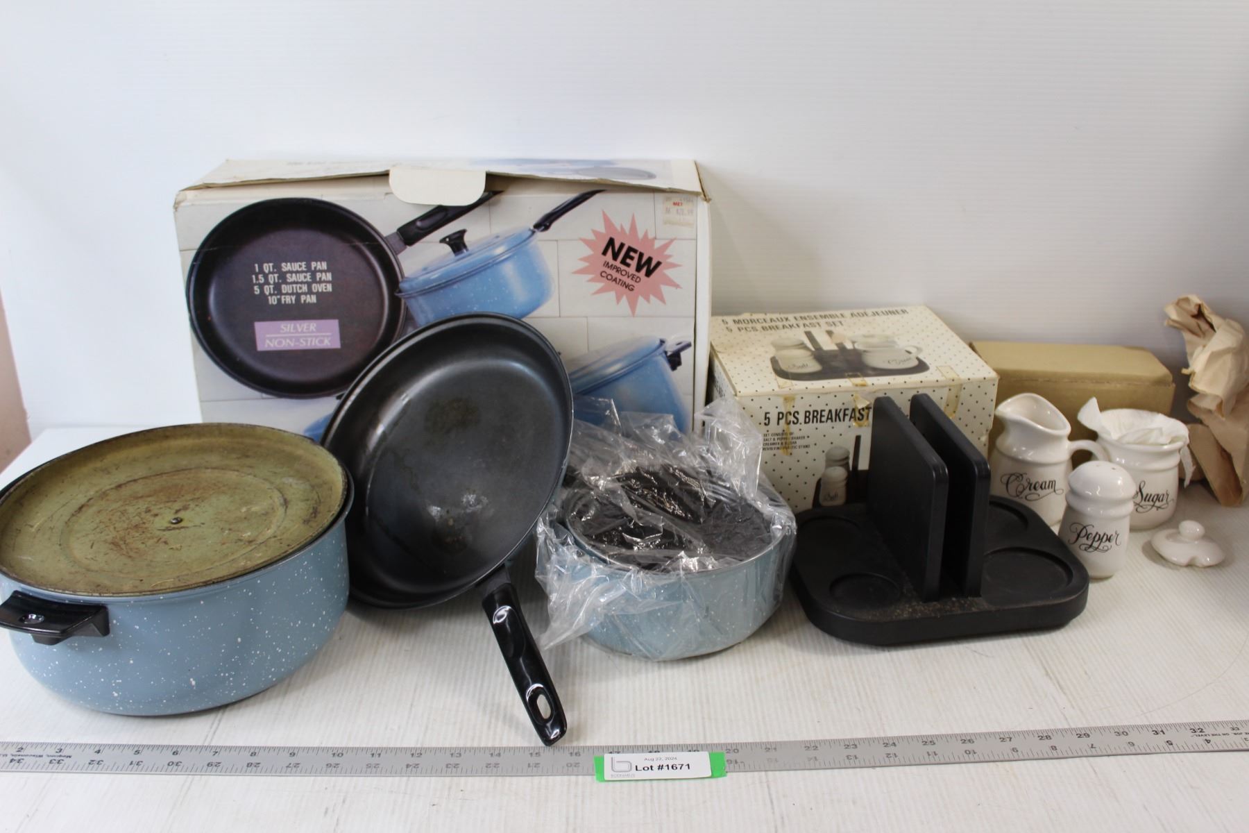 Seven Piece Non Stick Cooking Set, 5 Piece Breakfast Set - Missing Salt Shaker