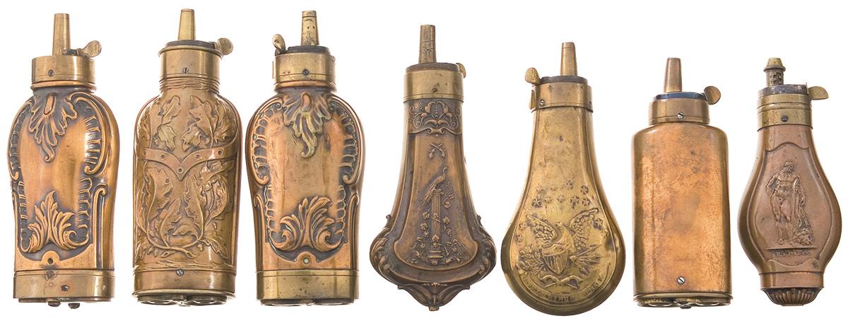Seven powder flasks with the following features: 1) Unmarked, 4", oak leaf motif on both sides, two compartments; 2) Unmarked, 3 3/4", E. Pluribus unum eagle motif on both sides; 3) Unmarked, 4", floral motif on both sides, two compartments; 4) Unmarked, 4", peacock on pedestal motif on both sides. 5) "B.A. PARIS" marked, 3 1/2", nude male figure motif on both sides; 6) unmarked, 3 1/4", plain, two compartments; and 7) As described in 3.