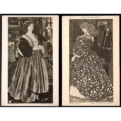 Seven antique postcards of Pre-Raphaelite paintings from English museums: 1. Burne-Jones - Loan - Clara Von Borck - National Gallery Millbank 2. Burne-Jones - Loan - Sidonia Von Borck - National Gallery Millbank 3. Burne-Jones - The Golden Stairs - National Gallery Millbank 4. Burne-Jones - Sibylla Delphica - Manchester Art Gallery 5. Rossetti - Beata Beatrix - National Gallery Millbank 6. Rossetti - Beloved - National Gallery Millbank 7. Rossetti - C. Rossetti and her Mother - National Portrait Gallery