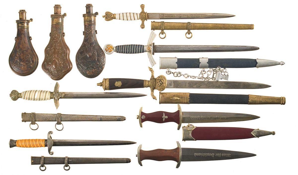 1-3) Three Hawksley powder flasks measuring 7 3/8 inches, 8 1/2 inches and 8 1/2 inches. The first is decorated with a hunting scene, the second features a scroll design and the third features an elaborate bird scene. 4) Second model Navy officer's dagger with 9 3/4 inch blade, gold wire wrapped grip and metal sheath. 5) German National Hunting Association dagger with 12 1/2 inch etched blade, wood grip and black leather wrapped sheath with brass fittings. 6) First model Air Force dagger with blue leather wrapped sheath, metal fittings and hanger. 7) Nazi second model Air Force Officers dagger with 10 inch blade and metal sheath. 8) Third Reich Army officer dagger with 9 1/2 inch blade, dark orange grip and metal sheath. 9) SA dagger with 8 1/2 inch blade, brown plastic grip and brown plastic sheath with silver fittings. 10) Nazi dagger with 8 1/2 inch Damascus blade marked "Alles fur Deutschland", wood grip and no sheath. All items are good or better.