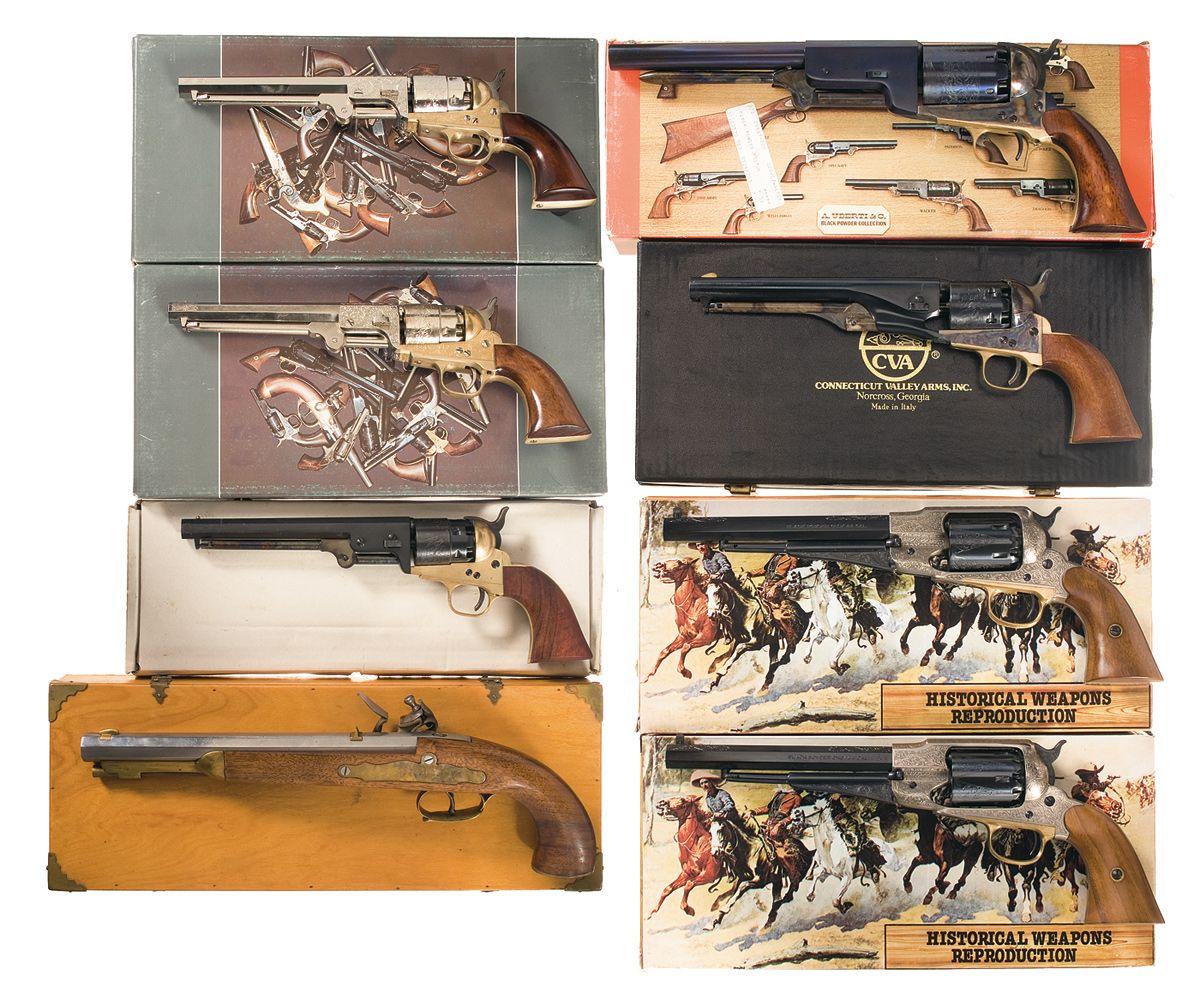 F) Standard markings and features with engraved cylinder scene. Complete with CVA hinged box numbered to gun. Consignor states gun is new in the box.