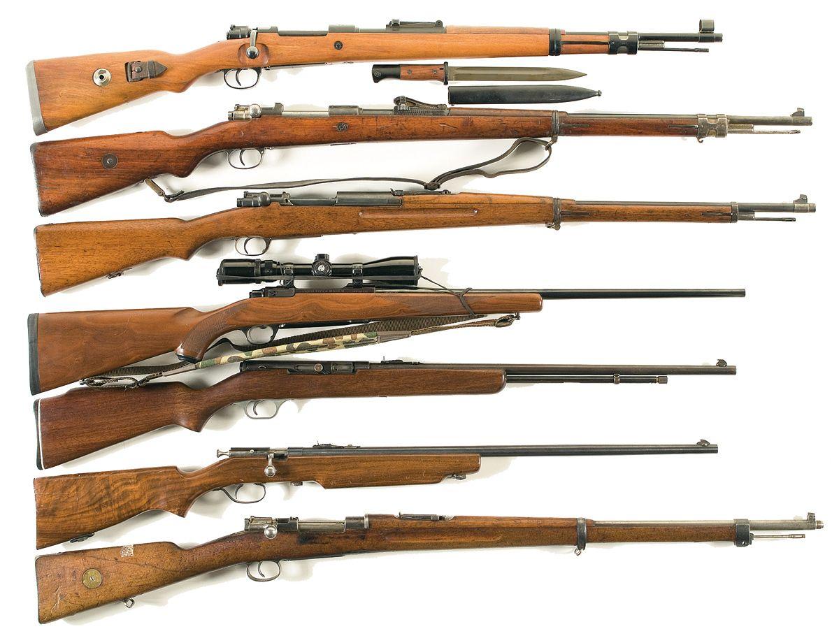 A) Portugal crest on top receiver with "1941" date underneath. German Eagle proof on left receiver with right side barrel marked "Eagle/WaA655". Matching numbers with buttplate stamped "brg/WaA491" and serial number stamped underneath buttstock. Complete with brown leather sling, matching bayonet and metal scabbard.