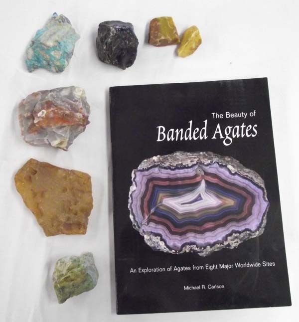 Seven Rock Specimens and Agate Rock Book. The largest rock is 5''L x 4.5''W. The Beauty of Banded Agates, book has 160 pages of beautiful illustrations and information.