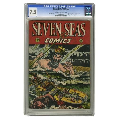 <B>Seven Seas Comics #1 (Universal Phoenix Feature, 1946) CGC VF- 7.5 Cream to off-white pages.</B></I> Matt Baker art is a point of major interest in this comic chock full of seafaring yarns. Overstreet 2006 VF 8.0 value = $544. CGC census 3/06: 1 in 7.5, 7 higher.