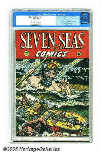 <B>Seven Seas Comics #1 (Universal Phoenix Feature, 1946) CGC NM- 9.2 Cream to off-white pages.</B></I> This series featuring nautical tales lasted only six issues, but benefited from the artistic talents of Matt Baker, beginning with this premiere issue for which Baker provided interior art. Overstreet 2005 NM- 9.2 value = $1,125. CGC census 5/05: 2 in 9.2, none higher.