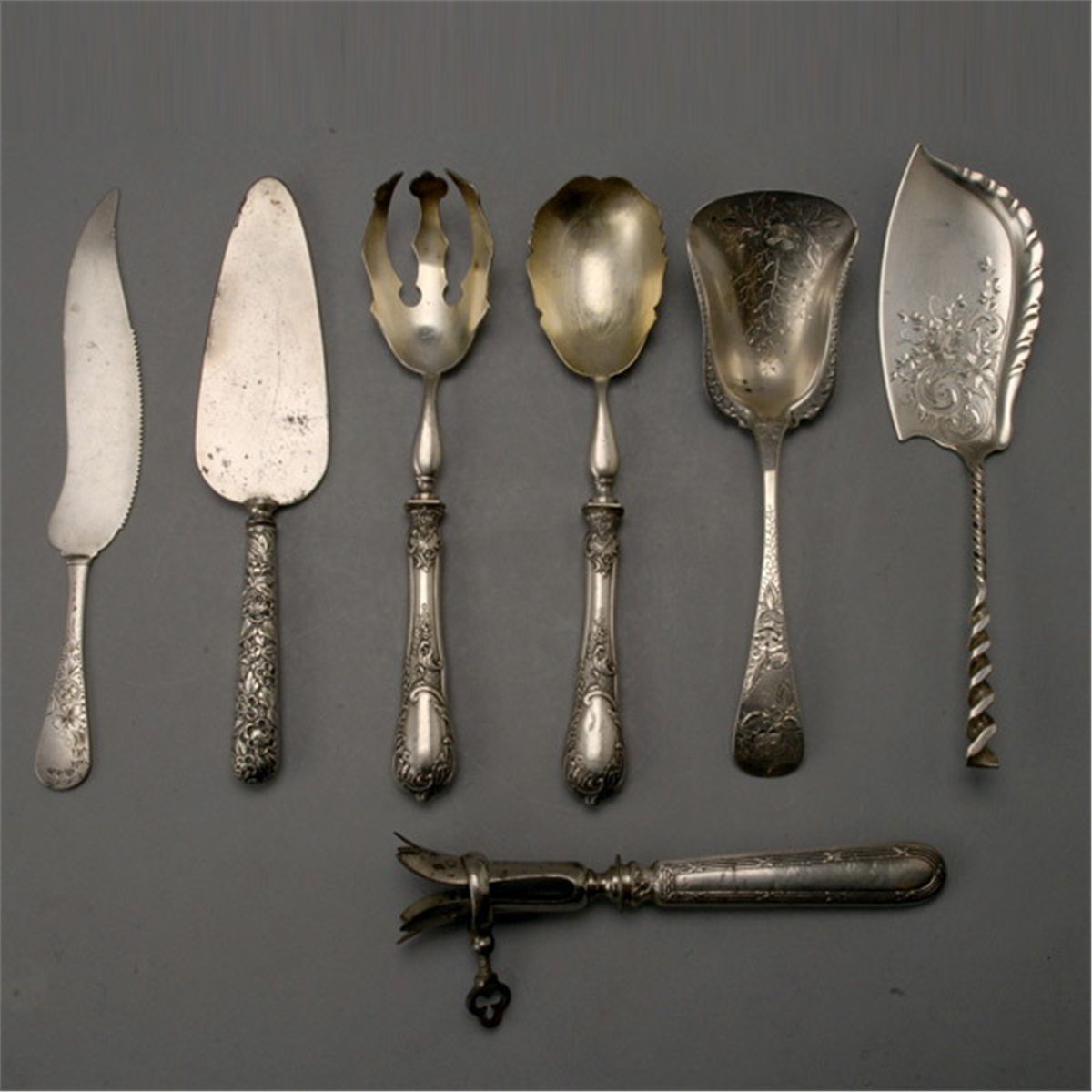 Seven Sterling or Sterling Handled Servers {Total weighable silver 8.43 troy oz; length of longest 10 1/2 inches}