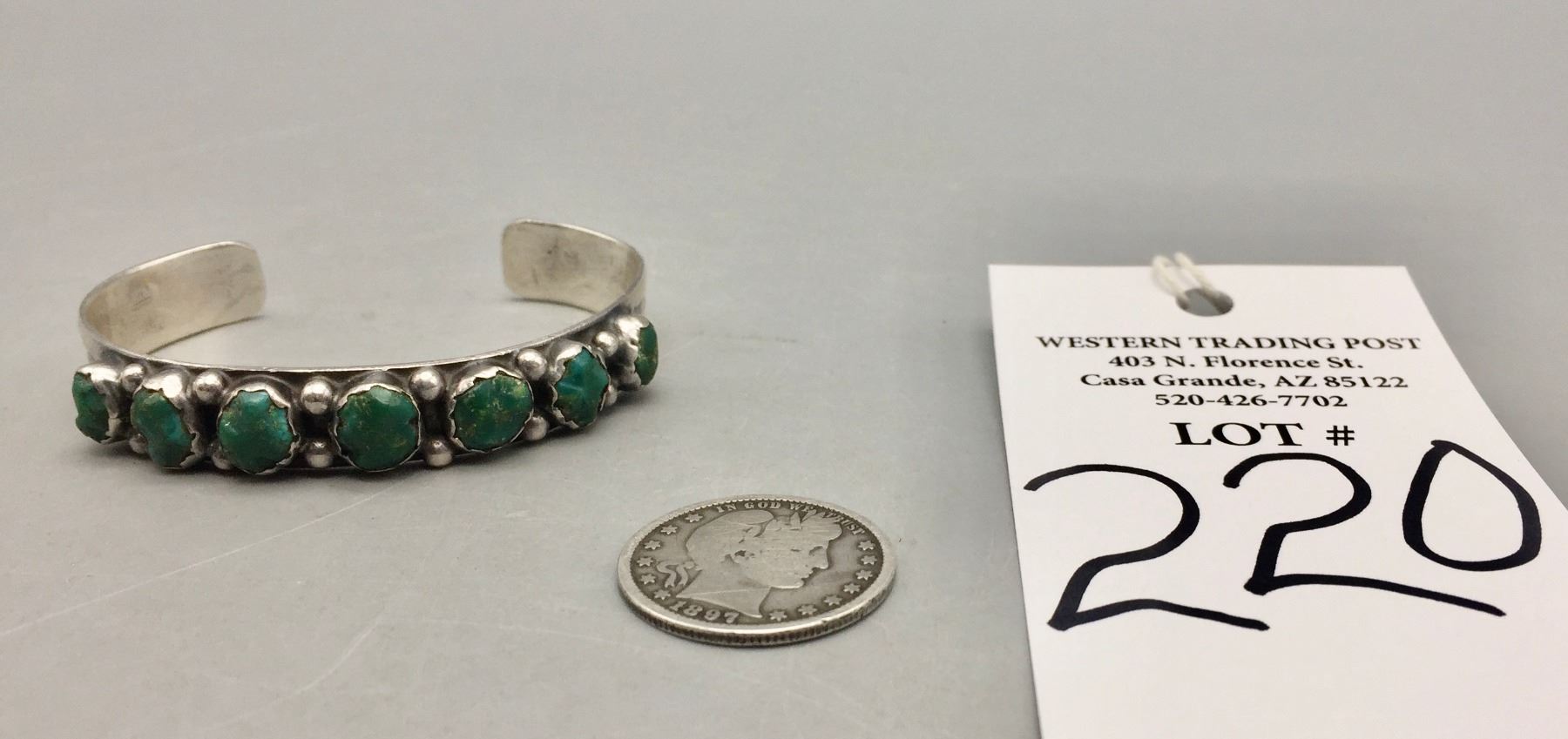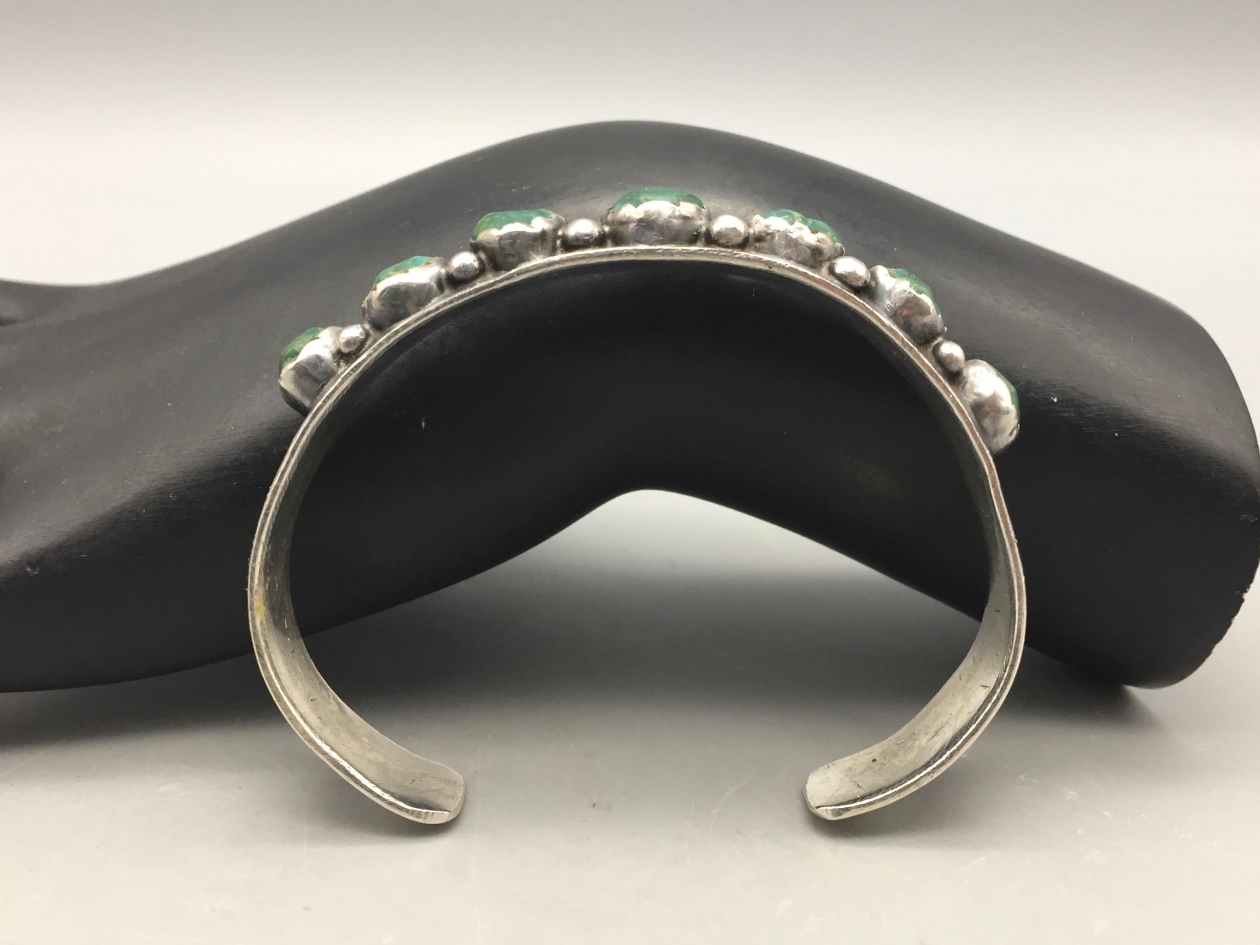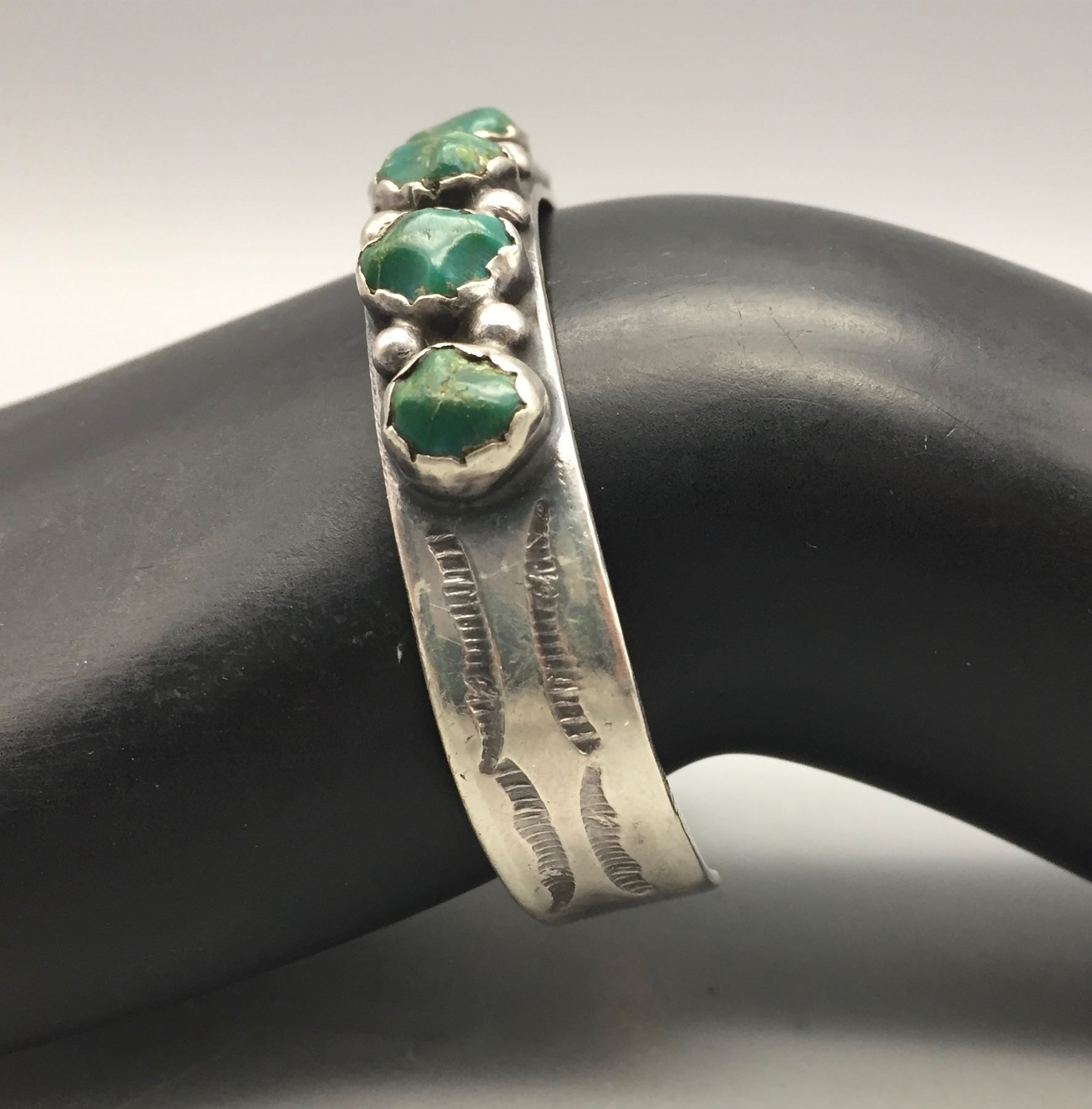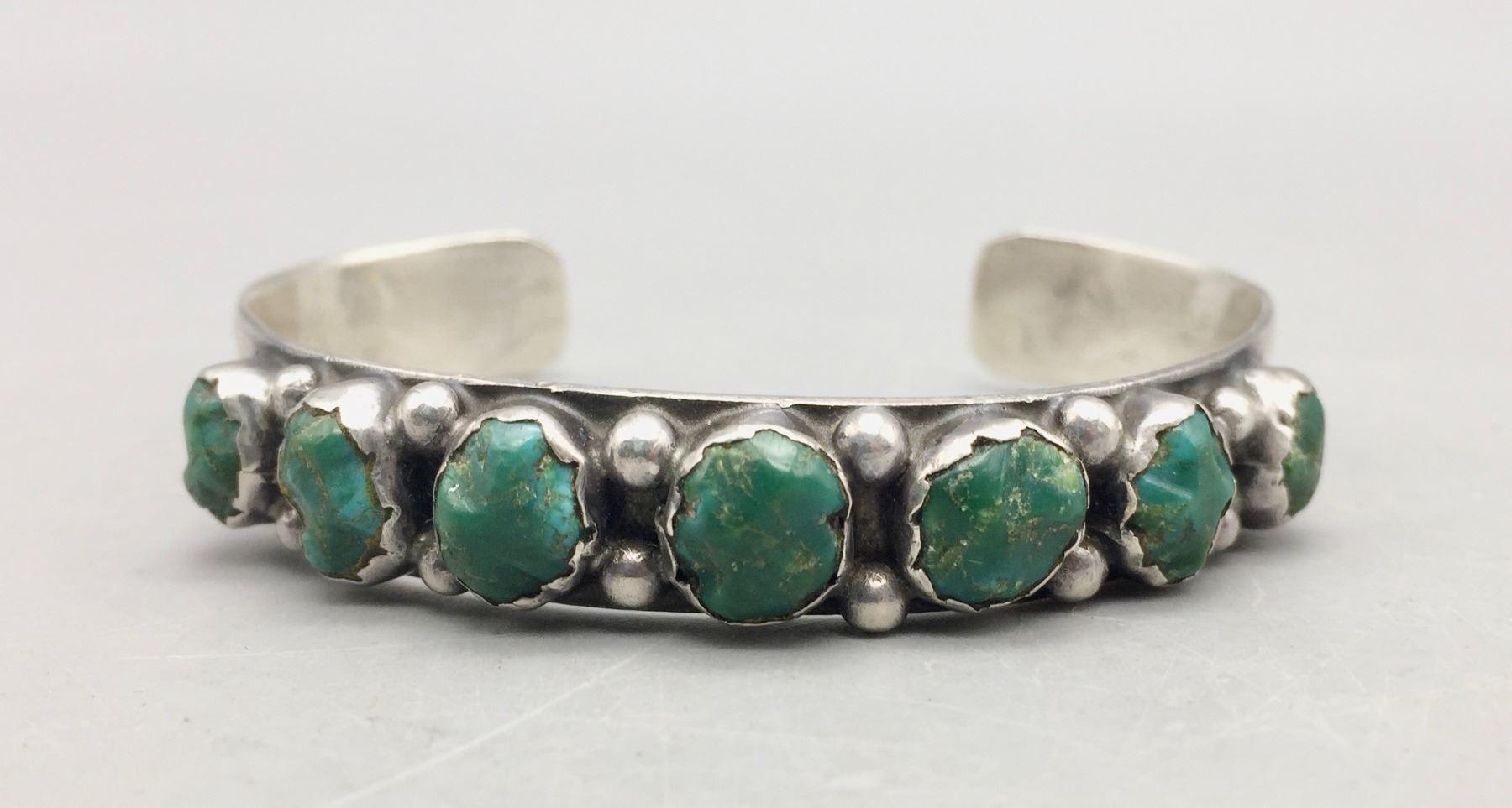 Description: Featured for sale in this lot is a hand stamped sterling silver bracelet featuring seven carved turquoise stones.