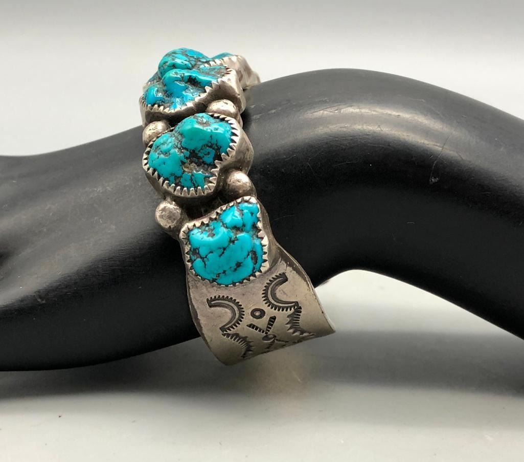 Offered for sale in this lot is a seven stone turquoise bracelet by Oscar Alexius. This is a fabulous retro style bracelet. It is set with seven beautiful turquoise cabochons that are accented with large, silver dots and hand stamped designs on the ends of the bracelet. It has a nice sturdy feel and is stamped as sterling. MAKER: Hallmarked in script handmade Oscar Alexius (1949-; Navajo). Active 1970s.  APPROX AGE: Circa 1980s-1990s. SIZE: Inside circumference measures 5-3/4 inches long. Opening is an additional 1-1/8 inches, fitting a 6-7/8 inch wrist. Width is 3/4 inches. Weighs 80.4 grams. CONDITION: Good for its age, normal wear expected. Please look closely at the pictures as they are an important part of our description and are hereby incorporated into the description, specifically with regards to condition. SHIPPING: There will be a $5 handling / packaging fee for shipping this lot. The actual cost of postage will be added on top of that. BUY IT NOW: If you would like to buy this item now, without waiting for the auction day to bid on it, we do offer this option (which is available up to 48 hours before the actual auction starts). The “Buy it Now†price is the high estimate of this lot (plus applicable fees and the Buyer's premium is discounted to 10% when using the Buy it Now option). If you would like to exercise this option, you must contact us by email (or phone as long as you talk to someone live). Reference this lot number and your intention to "Buy it Now."