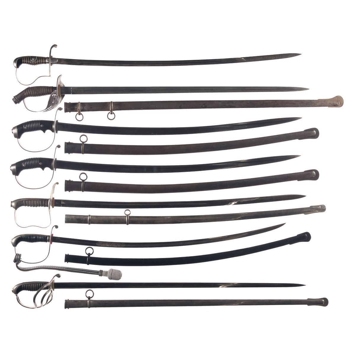 1) Sword, 32" blade with helmet logo on ricasso, wire and celluloid grip. 2) Horster sword, 31 1/2" 15-dated blade, Imperial designs on guard, wood and wire grip, metal scabbard. Pitting on scabbard. 3) Eickhorn sword, 31" blade, hard rubber grip, metal scabbard. 4) As 3. 5) Sword, 32 1/2" blade, stirrup guard, wire and sharkskin grip, metal scabbard. 6) Weyersberg Kirschbaum sword, 29 3/4" "IN/ TREUE/ FEST" etched blade, plastic grip, leather portapee, silver acorn, metal scabbard. 7) Unmarked sword, 32" blade, 3-branch guard, wire and horn grip, metal scabbard. With noted exception, all are good or better.