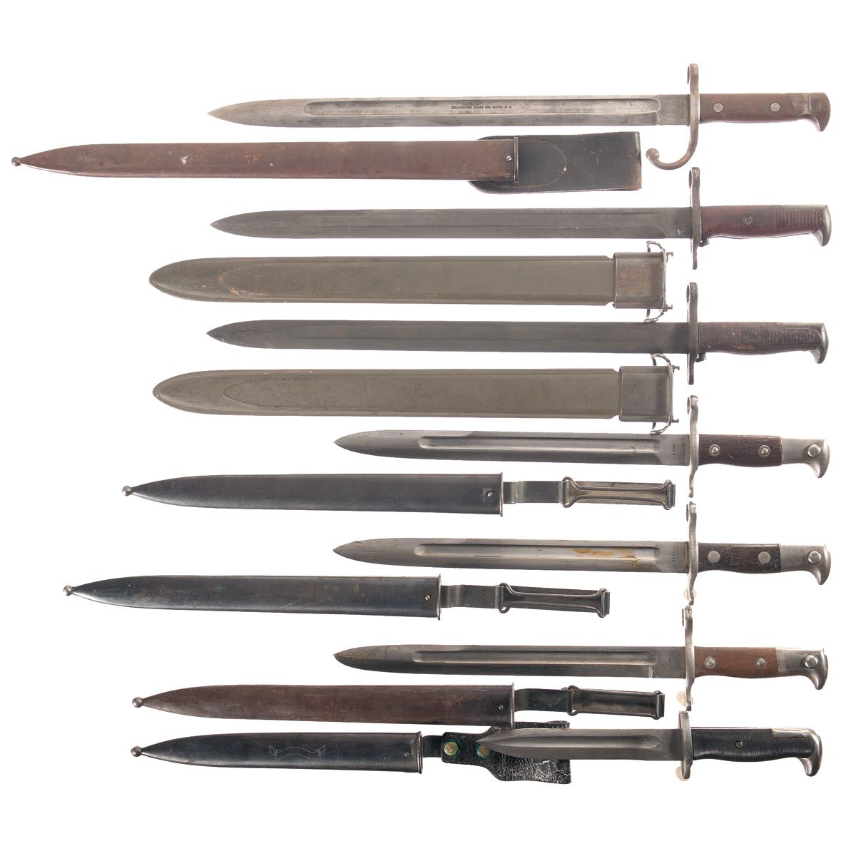 All have scabbards. 3 U.S. Krag bayonets, Krag bayonet with rare West Point cadet scabbard, Remington rolling block bayonet with a hook quillon, 2 U.S. Springfield Model 1903 bayonets. Overall items are in good to very good condition.