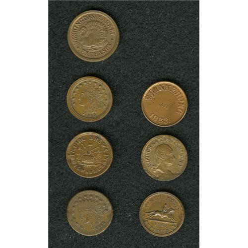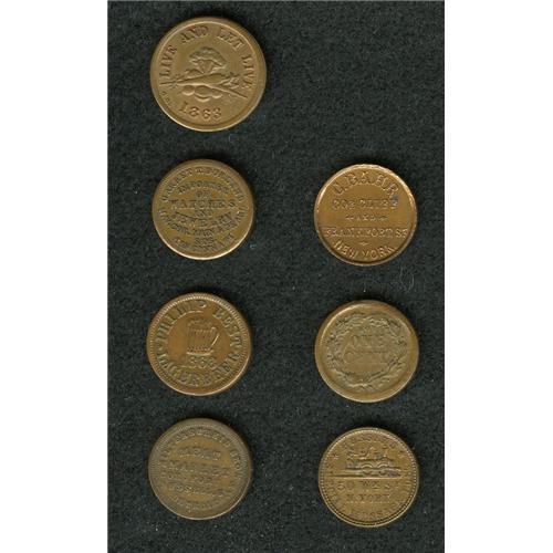 <B>An Uncertified Group of Seven Civil War Store Cards.</B></I> The lot includes: <B>1863 Hilterscheid Bros, Detroit, MI, VF30,</B></I> Fuld-MI225AM-1a, R.5; <B>1863 C. Bahr, New York, NY, AU50 Whizzed,</B></I> Fuld-NY630C-4a, R.2; <B>1863 C. Doscher, XF40,</B></I> Fuld-NY630V-7a1, R.4, prominent cuds, heavily clashed; <B>1863 Hussey's, New York, NY, AU50 Cleaned,</B></I> Fuld-NY630AK-2a, R.3; <B>1863 Washington Market, New York, NY, AU58,</B></I> Fuld-NY630CC-4a, R.2; <B>1863 Garret T. Dorland, Cincinnati, OH, AU55,</B></I> Fuld-OH165AJ-3a, R.4; and an <B>1863 Philip Best, Milwaukee, WI, AU55,</B></I> Fuld-WI510C-1a, R.2.<BR><BR><b>Shipping:</b> Coin/Currency (<a target="_blank" href="http://www.heritageauctions.com/common/shipping.php">view shipping information</a>)