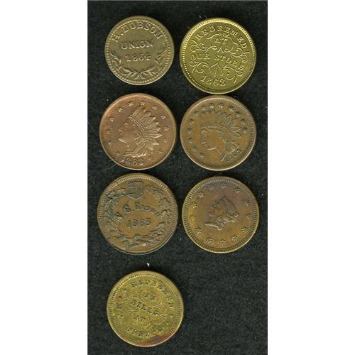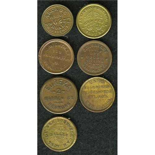 <B>An Uncertified lot of Civil War Store Cards.</B></I> The lot includes: <B>1863 J. Wightman, Newark, NJ, AU55 Cleaned,</B></I> Fuld-NJ555C-2a, R.3; <B>1863 M.S. Brown, New York, NY, AU58,</B></I> Fuld-NY630N-4a, R.2, a spectacularly shattered obverse die; <B>Undated Oliver Boutwell, Troy, NY, AU50 Cleaned, Lightly Corroded,</B></I> Fuld-NY890B-33b, R.6; <B>1863 Robinson & Ballou, Troy, NY, AU50 Whizzed,</B></I> Fuld-NY890E-7b, R.4; <B>1863 J.D. Bailey, Gallapolis, OH, AU55,</B></I> Fuld-OH345A-1a, R.8, a rarely seen merchant; <B>Union Volunteer Saloon, Philadelphia, PA, XF45 Lightly Corroded,</B></I> Fuld-PA750W-2b, R.9, rare patriotic die reverse; and an <B>1864 Arcade House/H. Dobson, Providence, RI, AU50 Lightly Cleaned,</B></I> Fuld-RI700A-4a, R.3.<BR><BR><b>Shipping:</b> Coin/Currency (<a target="_blank" href="http://www.heritageauctions.com/common/shipping.php">view shipping information</a>)