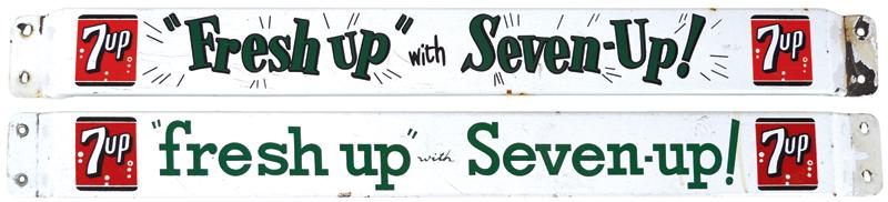 Seven-Up porcelain door pushes, "Fresh Up with Seven-Up", 2 styles, VG cond, 3"H x 31.5"W.