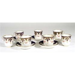 Seven Victorian Coalport cups and five saucers, hand painted and gilded with swags and flowers onto a cobalt blue ground, marks to bases