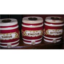 Seven Victorian barrels, each of the oval sectioned shapes with bands of wine red and bearing names: shrub, cloves, bitters, vinegar, aniseed, mint and raspberry, their lids and spigots of metal, 30cm high (7) £500-600